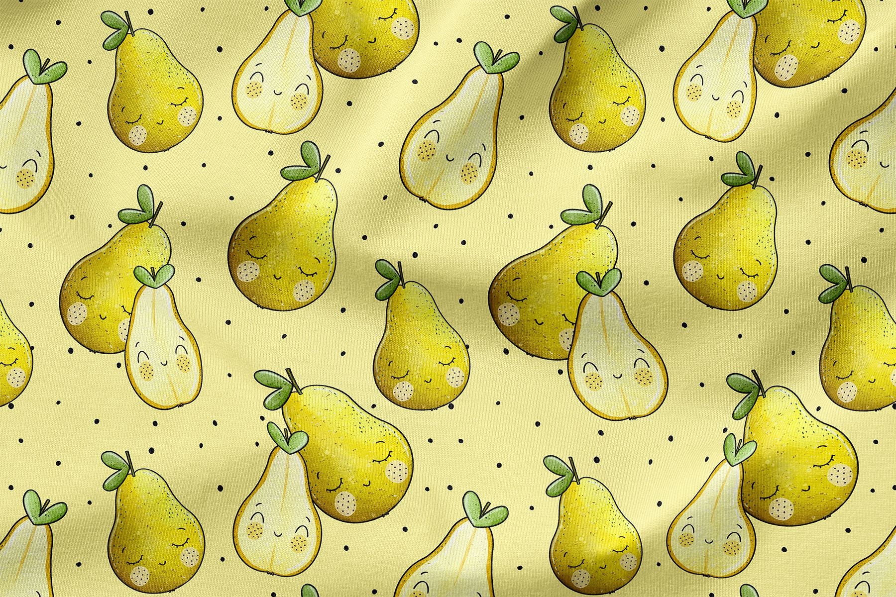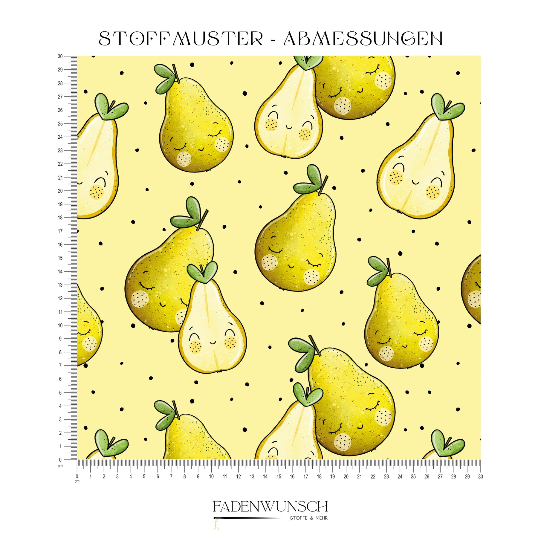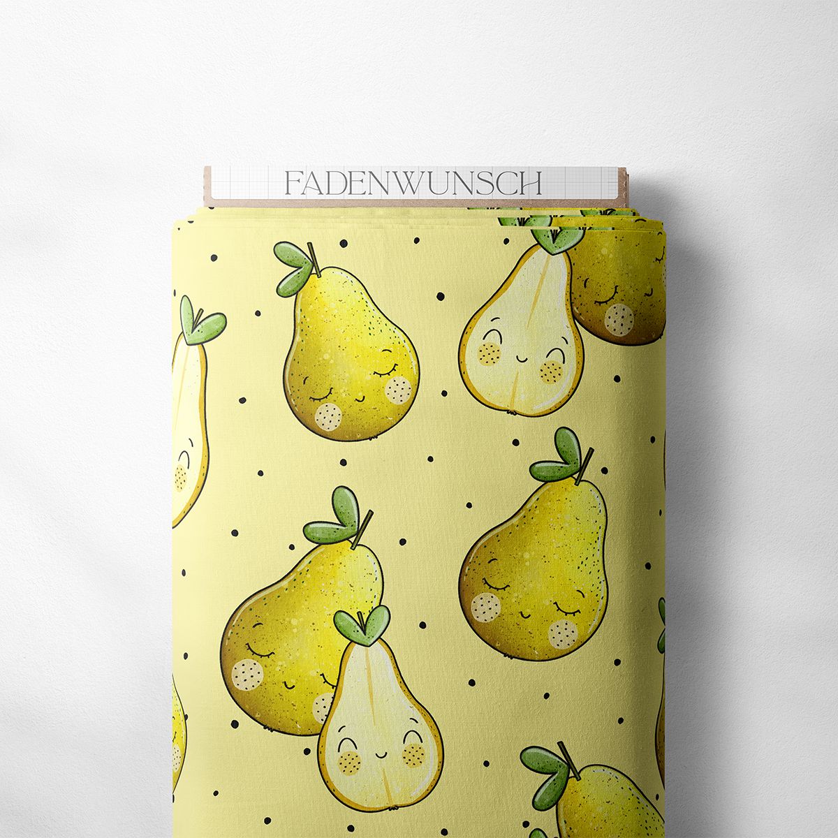 Freundliche Birnen mit kleinen Gesichtern auf sonnengelbem Hintergrund sorgen für richtig gute Laune beim Nähen. Dieses fröhliche Design ist perfekt für sommerliche Kleidung, Kinderoutfits oder farbenfrohe Accessoires.