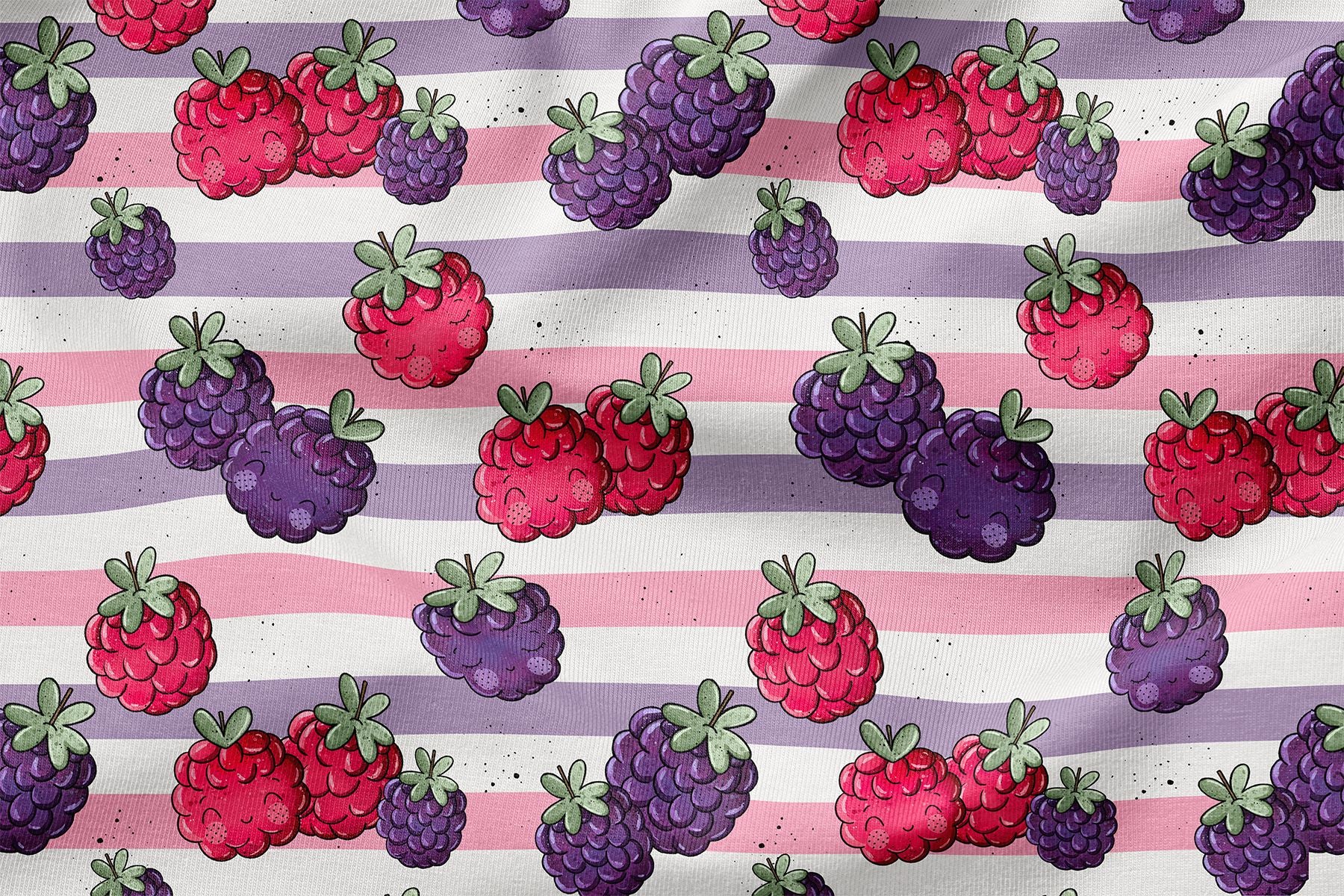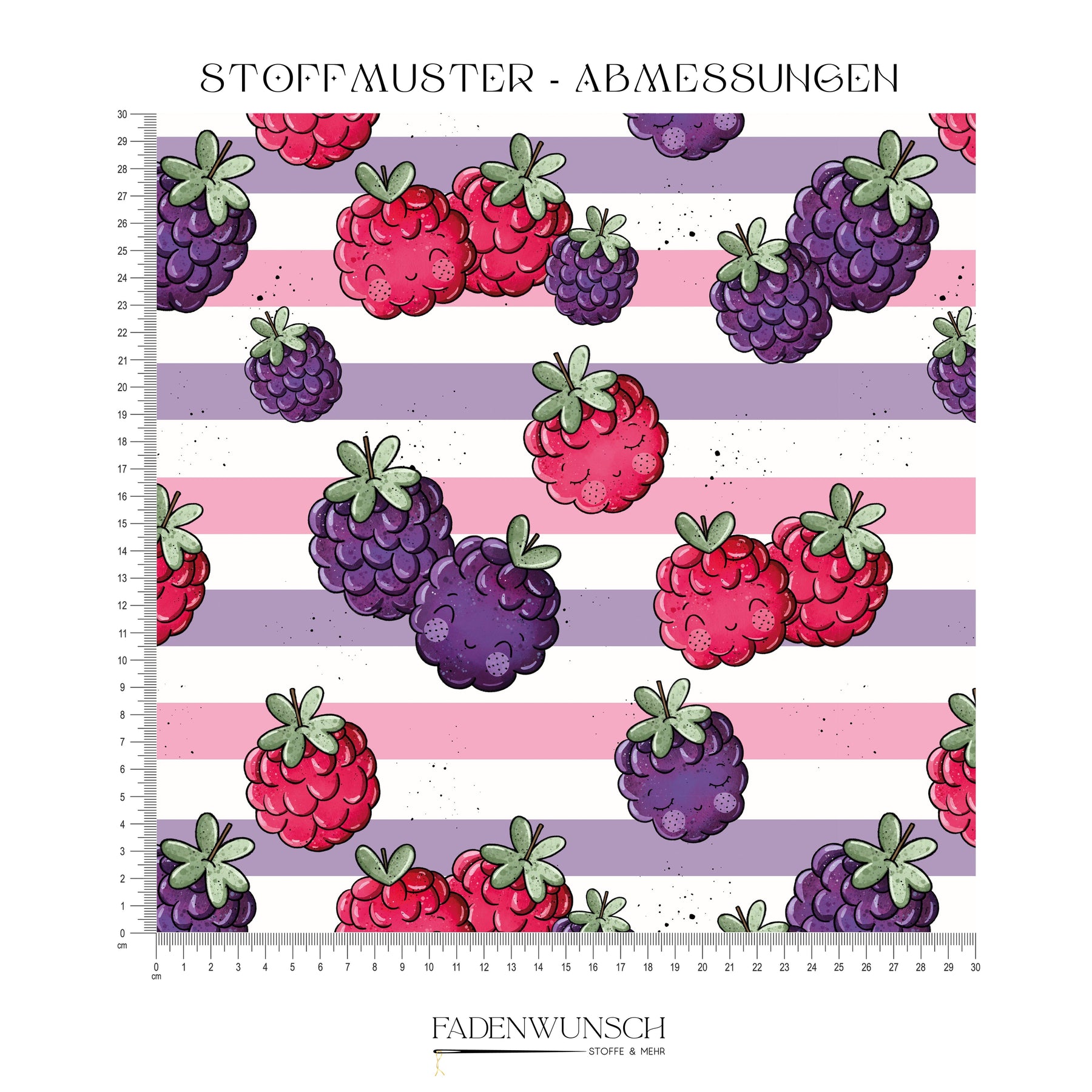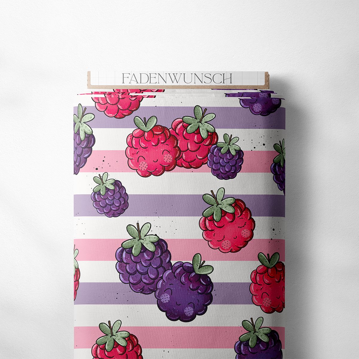 Saftig bunte Brombeeren und Himbeeren tummeln sich auf fröhlichen Blockstreifen in Rosa, Lila und Weiß – ein Design, das sofort gute Laune macht. Perfekt für farbenfrohe Nähprojekte wie Shirts, Kleider, Röcke oder Kinderoutfits, die nach Sommer und Leichtigkeit aussehen.