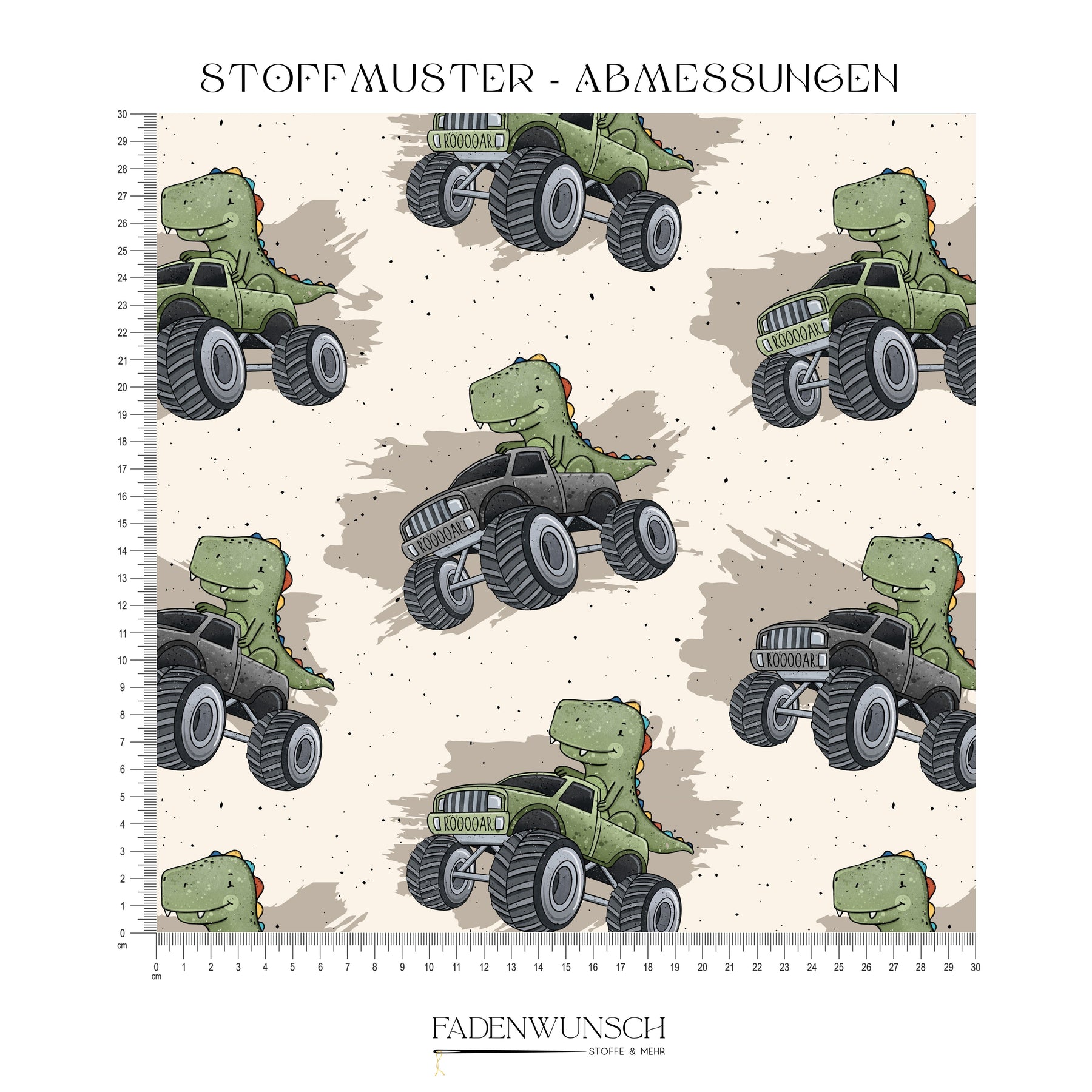Ein wilder Dino am Steuer eines fetten Monstertrucks – dieses Design ist einfach unschlagbar cool. Mit matschigen Reifenspuren und frechen Details bringt „Dino Monstertruck“ richtig Action auf den Stoff und lässt Kinderaugen leuchten.
