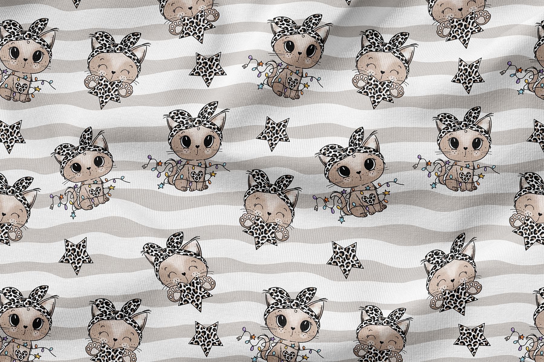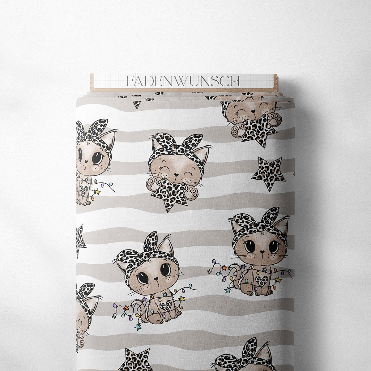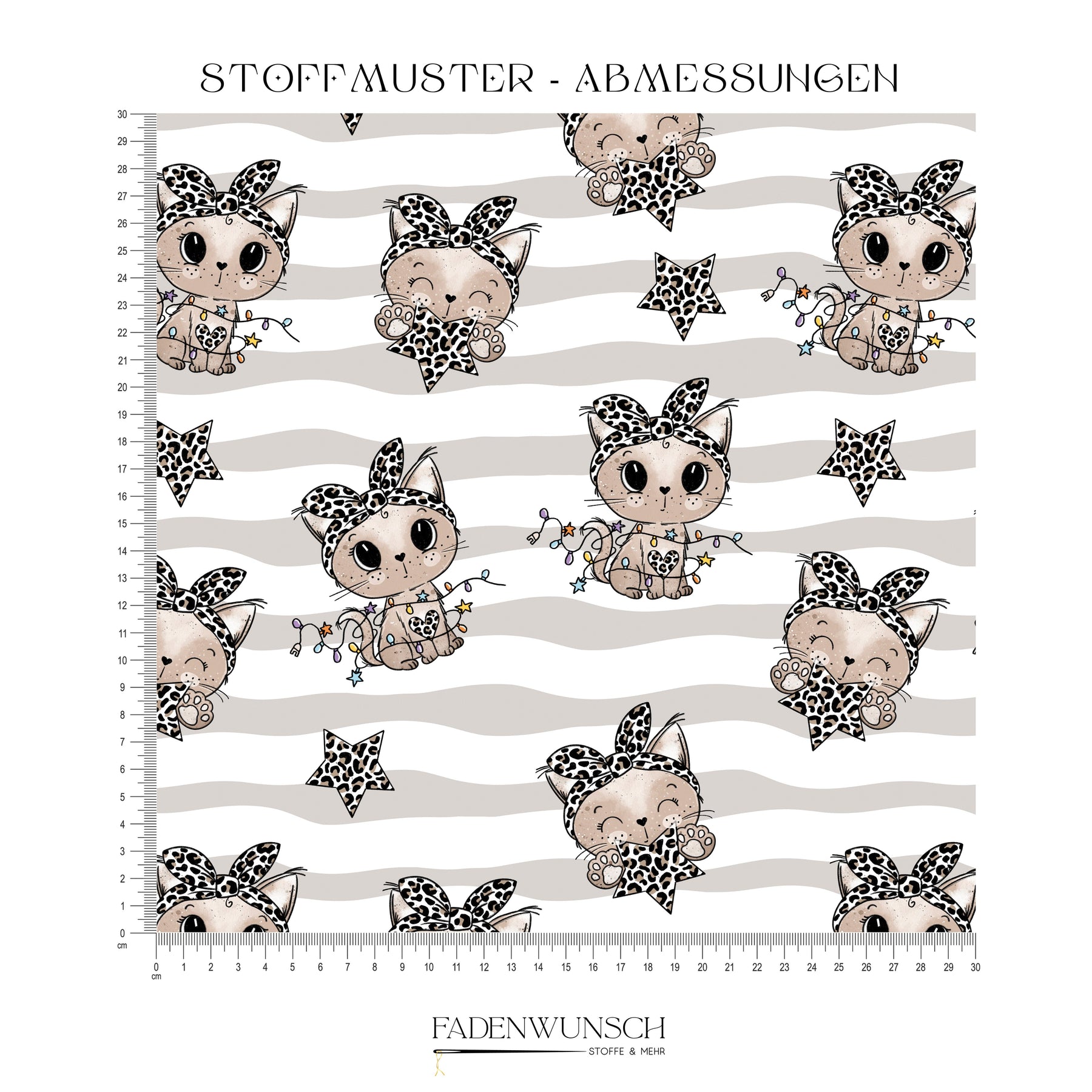 Süße Kätzchen mit Leoparden-Stirnband, verspielten Sternen und einer bunten Lichterkette zaubern dir sofort Weihnachtslaune ins Herz. Die dezenten Wellenstreifen im Hintergrund geben dem Design eine moderne Note, die perfekt zu festlichen und winterlichen Outfits passt.