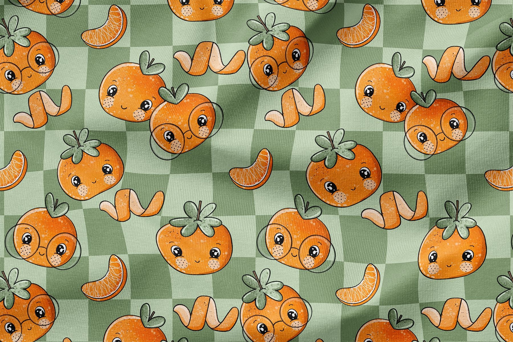 Mit diesem Stoffdesign kommt garantiert gute Laune an die Nähmaschine! „Mandarine“ zeigt süße kleine Mandarinenköpfe mit fröhlichen Gesichtern, Scheiben und Schalenstücken – alles auf einem grünen Karo-Hintergrund. Ein Design, das einfach zum Reinbeißen süß ist und direkt Lust auf kreative Projekte macht.