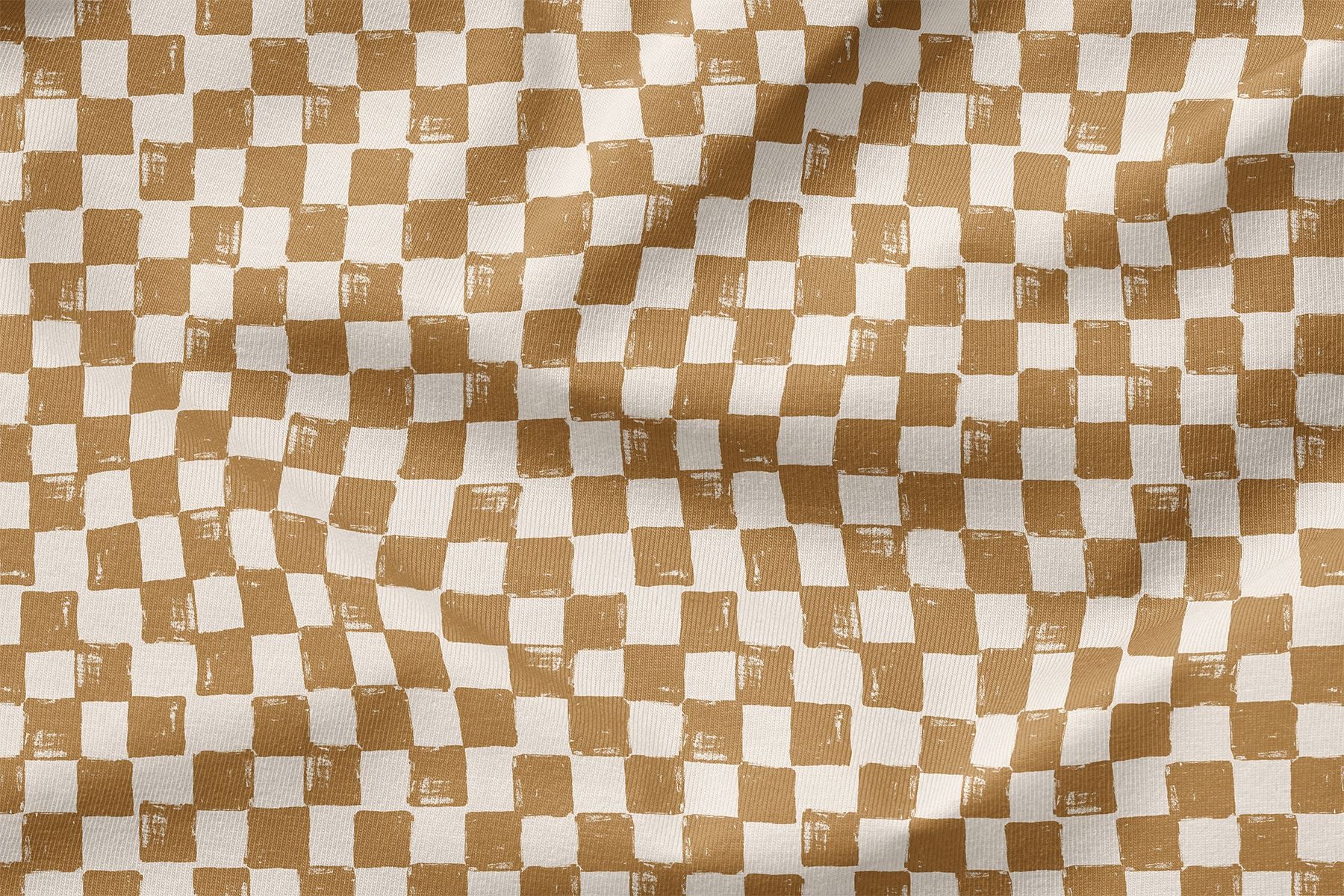 Kariert, kratzig, cool: Dieses rough & ready Schachbrettmuster in Beige-Gold ist der ideale Kombistoff zu „Bau Scratchi“ – passt aber auch solo einfach genial.
