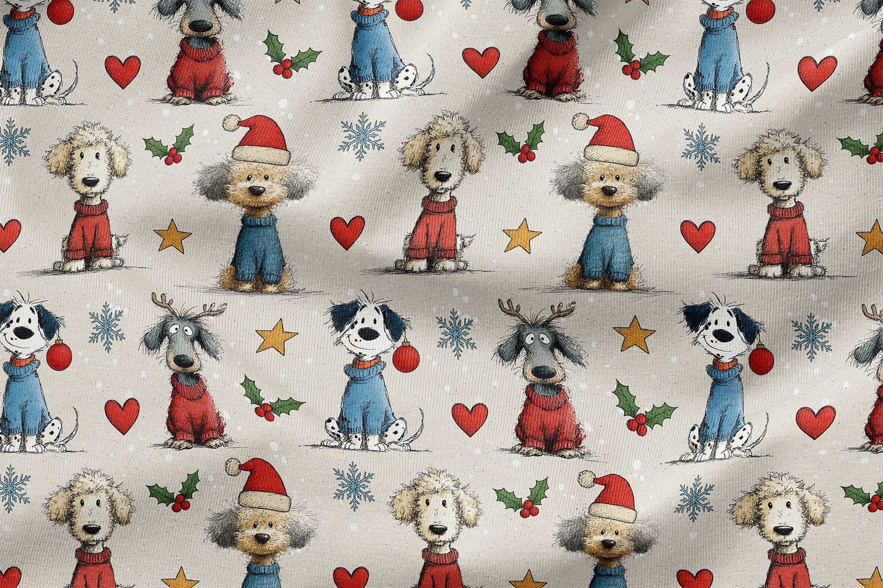 Süße Hunde im Weihnachtslook – mit Mütze, Pullover und Rentiergeweih – machen diesen Stoff zu einem echten Winterliebling. Dazu Schneeflocken, Sterne und Mistelzweige – perfekt für festliche Outfits, kuschelige Pullover, Kinderkleider oder kreative Deko-Ideen.