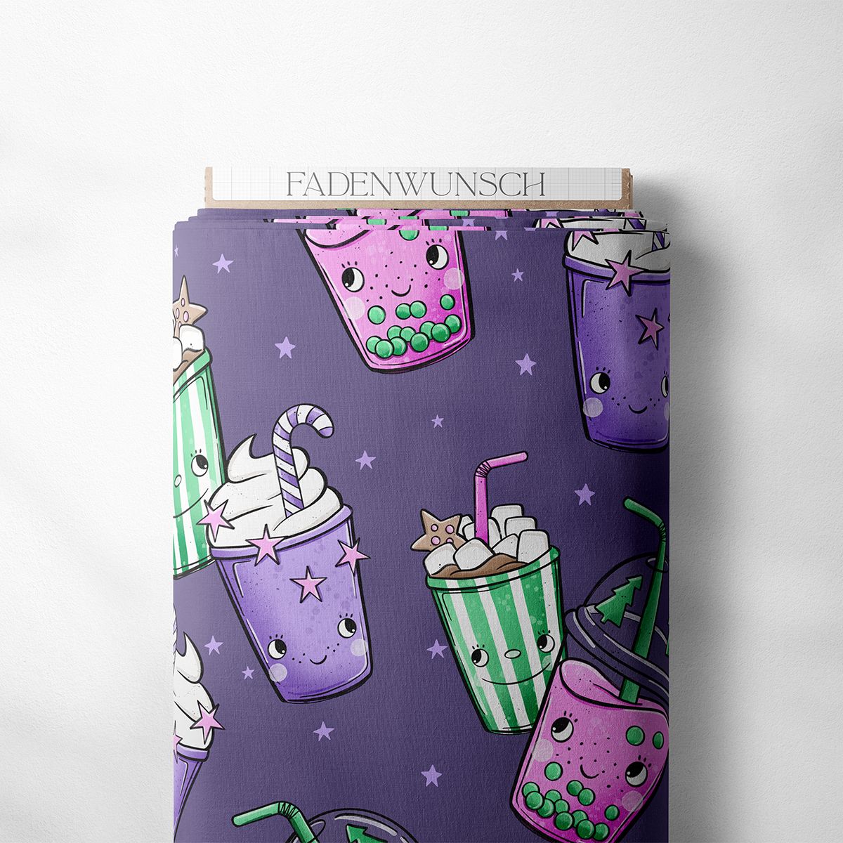 Tauche ein in ein winterlich-verspieltes Stoffdesign mit lila Sternenhimmel, fröhlichen Weihnachtsdrinks und süßen Marshmallows! Ob Bubble Tea mit Zuckerstange oder niedliche Becher mit Sahnehaube – dieser Stoff macht einfach gute Laune! Ideal für gemütliche Nähprojekte wie Hoodies, Pumphosen, Sweatkleider oder Loopschals.