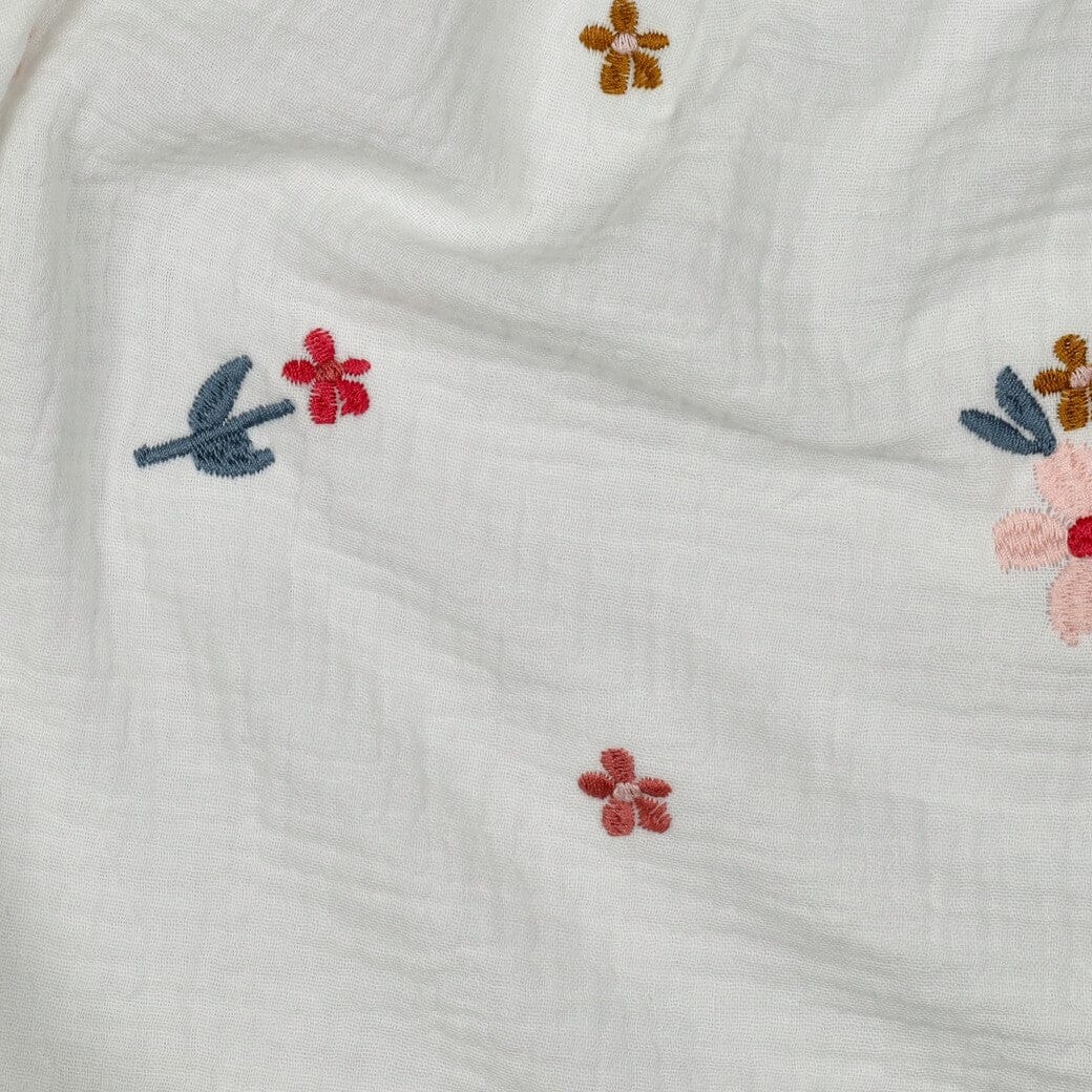 Der weiche Musselin aus reiner Baumwolle ist angenehm luftig und sanft auf der Haut. Die feine Stickerei bringt eine besondere Struktur in den Stoff und verleiht ihm eine hochwertige, liebevolle Note, ohne die typische Leichtigkeit von Musselin zu verlieren.