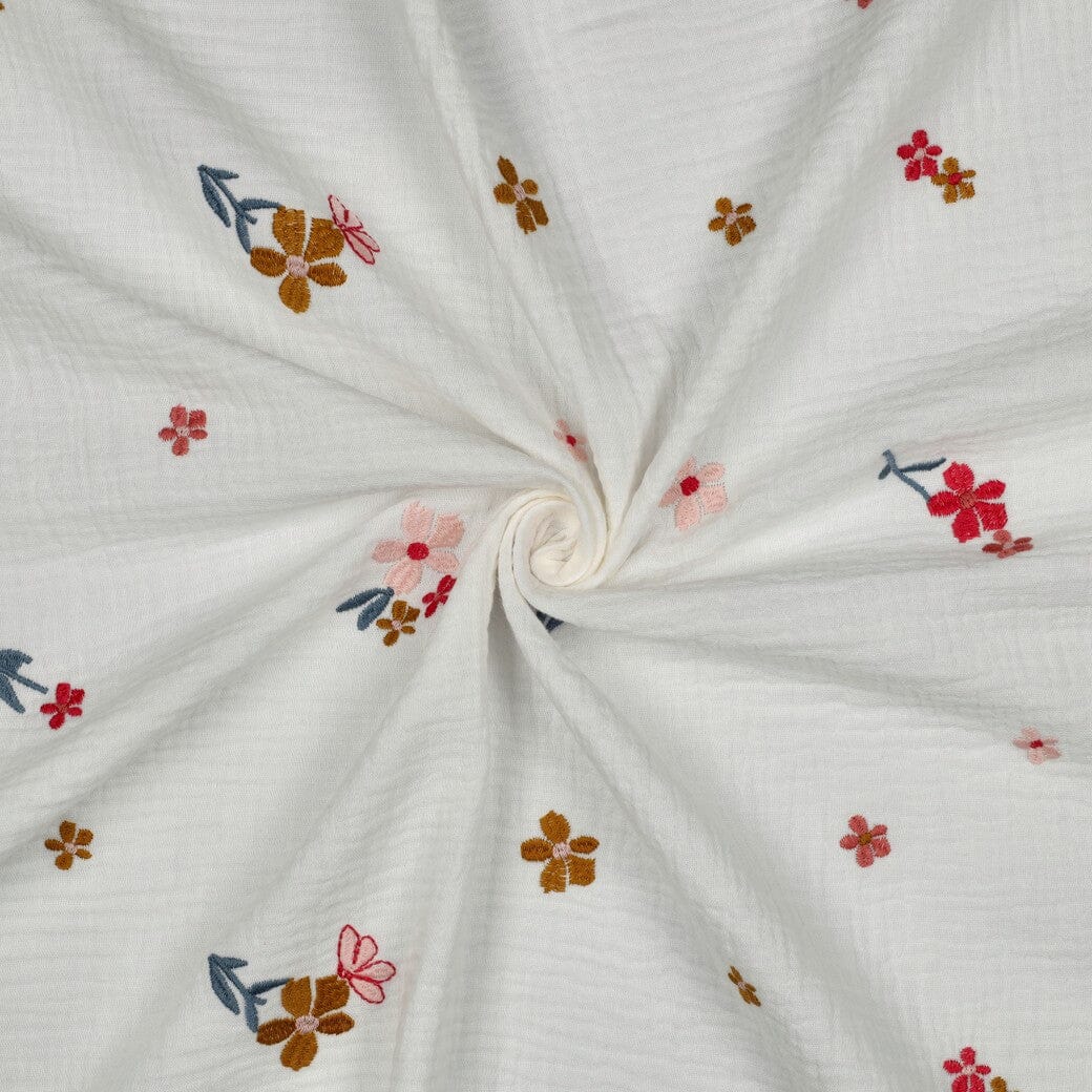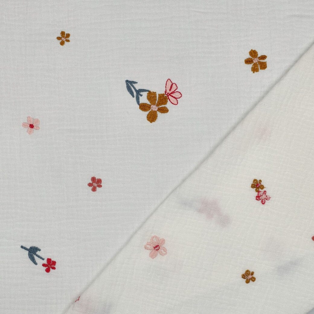 „Wiesenflüstern“ – bestickter Musselin in Naturweiß & Kamel