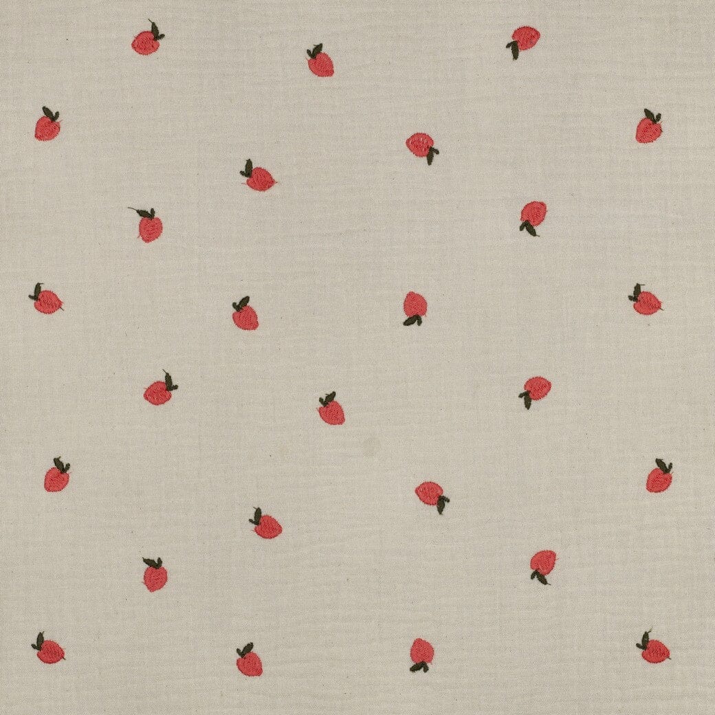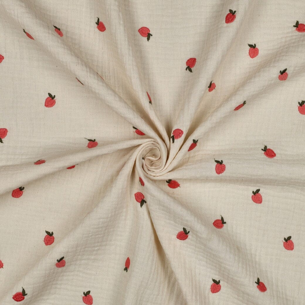 „Sommerpfirsich“ – bestickter Musselin in Natur mit kleinen Pfirsichen