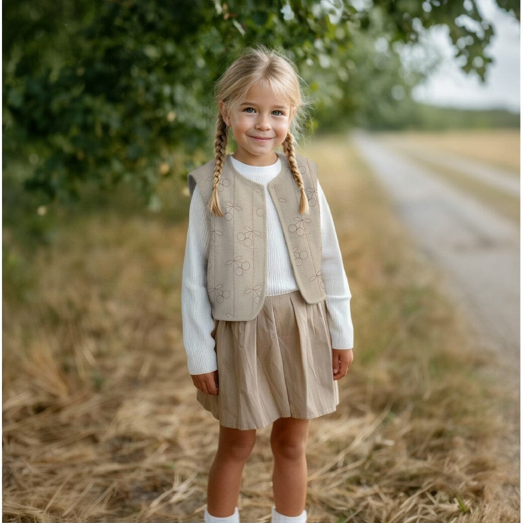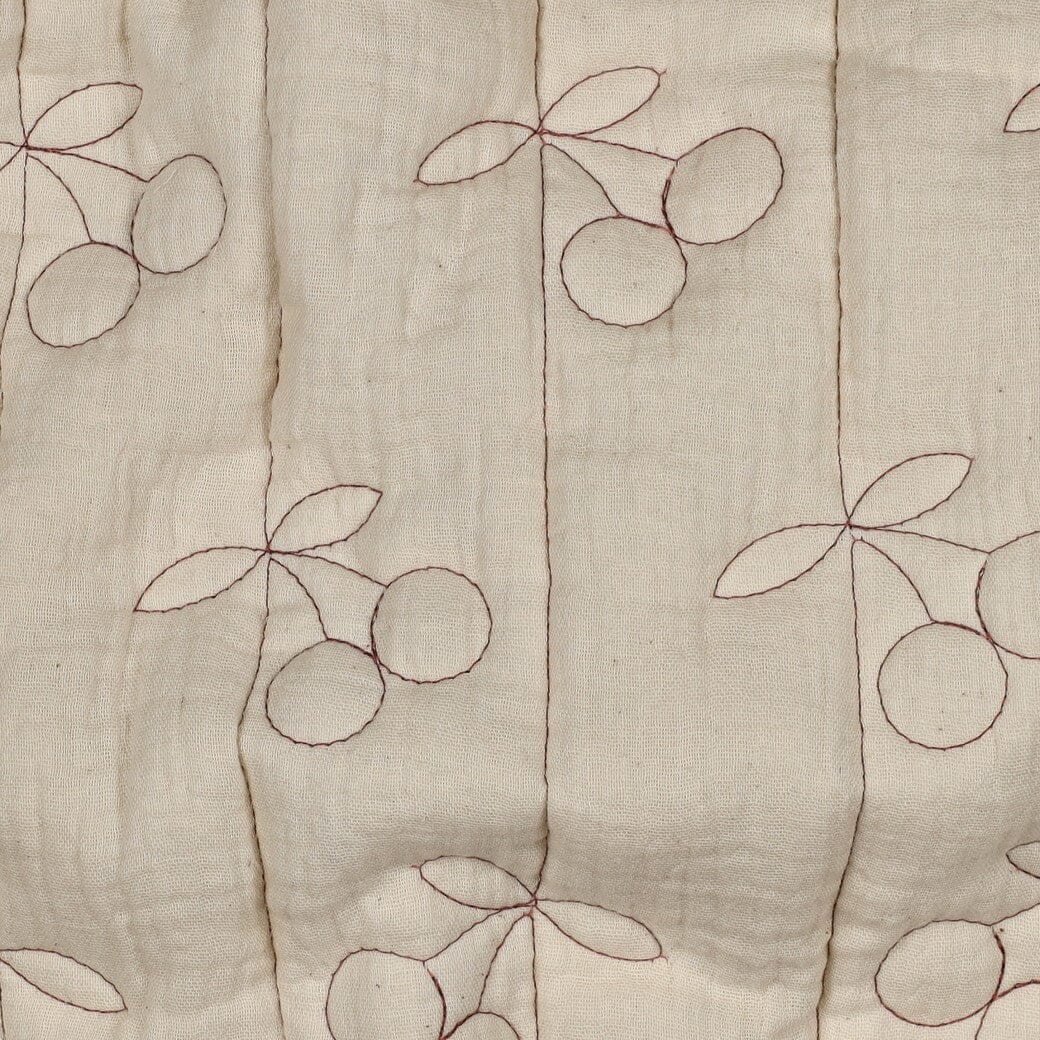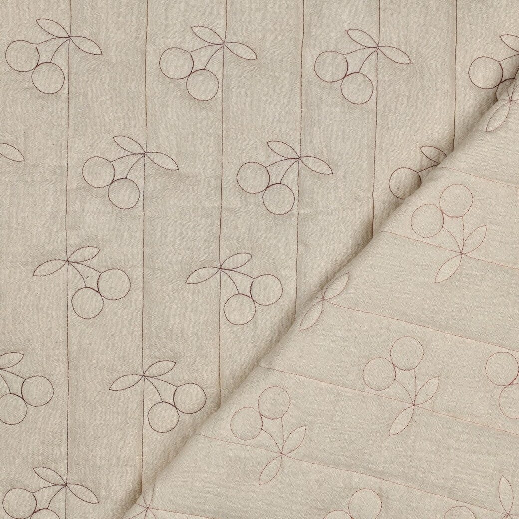 „Kirschen Natural“ kombiniert ein zartes, ruhiges Design mit einer ganz besonderen Haptik: außen Musselin, innen Musselin – dazwischen weich gesteppt. Und genau das macht diesen Stoff so besonders.