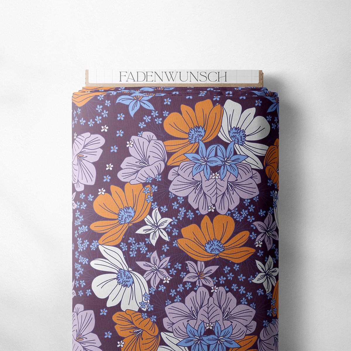 Dieses verspielte Design bringt große und kleine Blüten in zartem Flieder, Sonnengelb, Hellblau und Creme auf einen kräftig violetten Hintergrund. Ideal für Kleider, Röcke, Kissen oder Accessoires mit Vintage-Charme. „Blümchen – Lila“ blüht auf jeder Nähidee auf – nicht nur im Frühling!